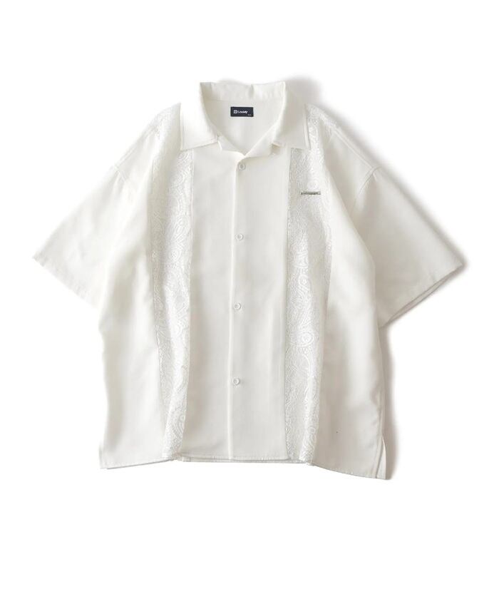 レース生地で切り替えたルーズシルエットオープンカラーシャツ。