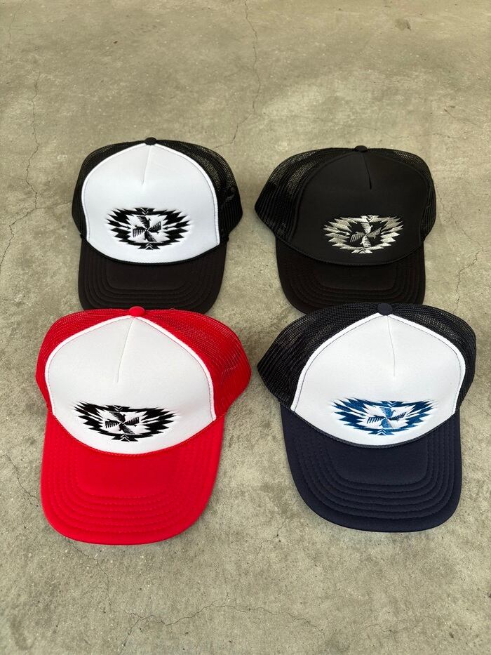 七本羽のサンダーバードと、マライカでは幸運の象徴として馴染み深いスワスティカを組み合わせたありそうで無いオリジナルネイティブパターンとして描き起こした柄を度詰の刺繍にて施したトラッカーキャップになります。