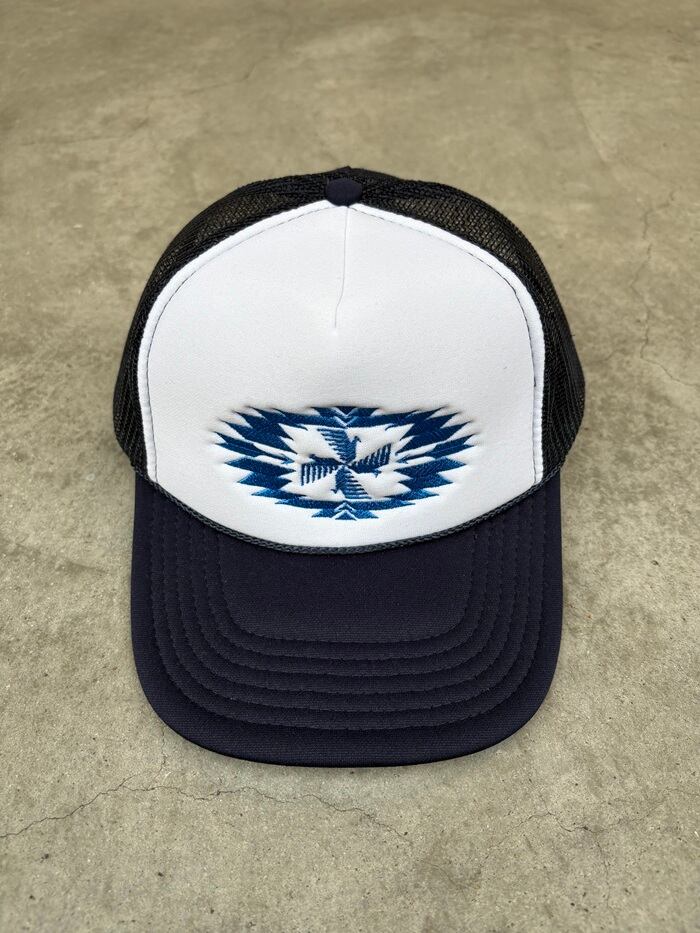 七本羽のサンダーバードと、マライカでは幸運の象徴として馴染み深いスワスティカを組み合わせたありそうで無いオリジナルネイティブパターンとして描き起こした柄を度詰の刺繍にて施したトラッカーキャップになります。