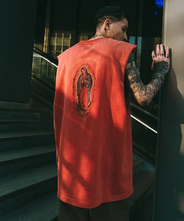 バックには、ブランドを象徴するマリアをプリント、フロントにはブランドロゴを刺繍にてデザインを落とし込まれております。