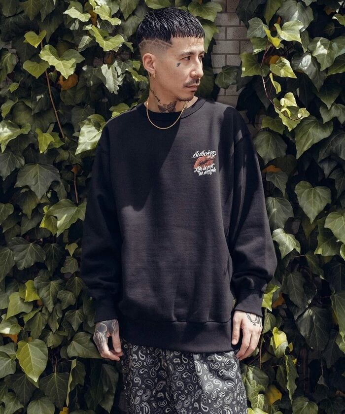 左胸には女性の唇とLife is not so simpleの文字を組み合わせたメッセージ性のあるグラフィックを、バックには煙に覆われた怪しい雰囲気漂うガールズグラフィックをプリントで施しました。左裾にはシグネイチャーカラーの裾タグを配備。