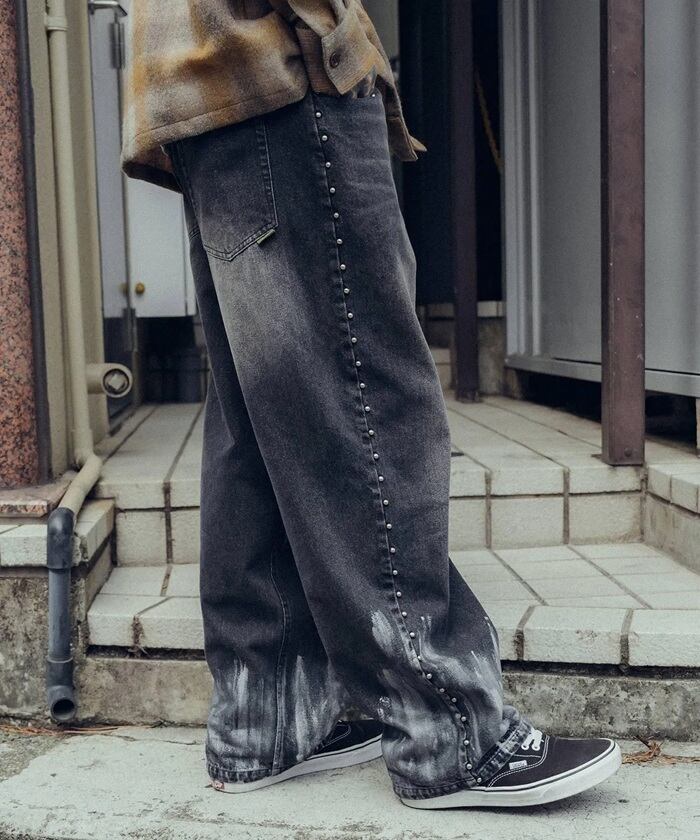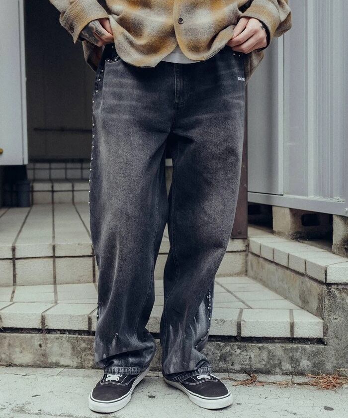 スタッズを打ち込みウエスタンやインダストリアルの雰囲気を漂わせるデニムパンツ。