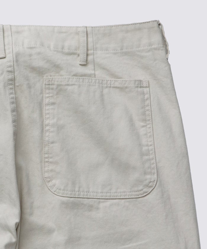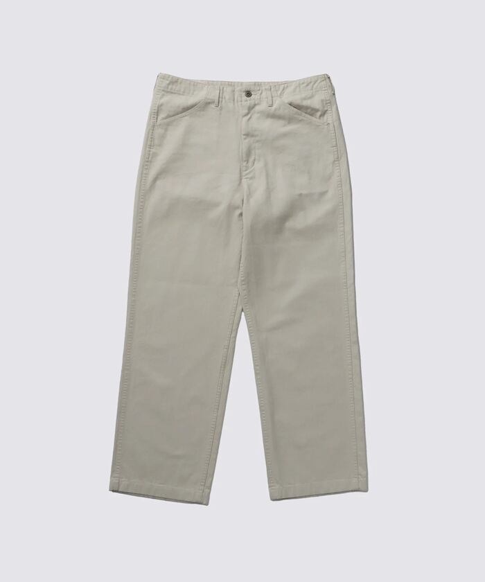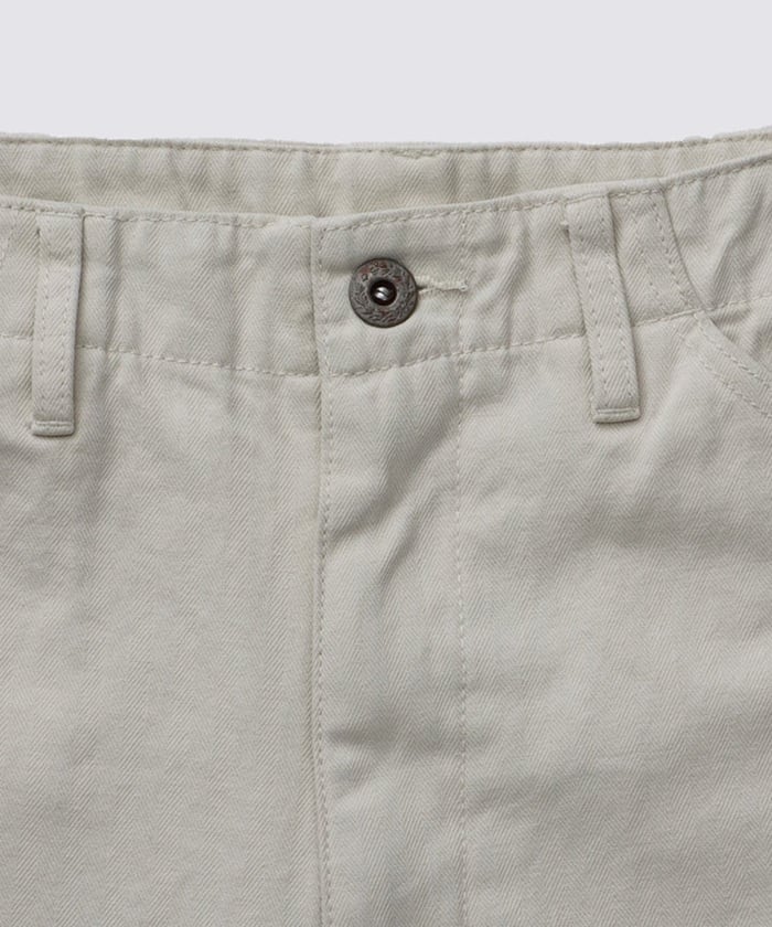 1940年代のアメリカ軍ユーティリティパンツをベースにデザインした、ミリタリーテイストのトラウザーズです。 上品な光沢と表情のあるコットン100%のヘリンボーンツイル生地を採用し、無骨さの中に洗練された印象を与えます。