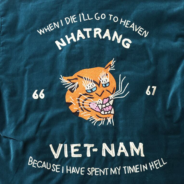 キルティングサイドには、バックへベトナムMAP柄を右胸へ虎と左胸へは、アメリカとベトナムのクロスフラッグを刺繍されております。