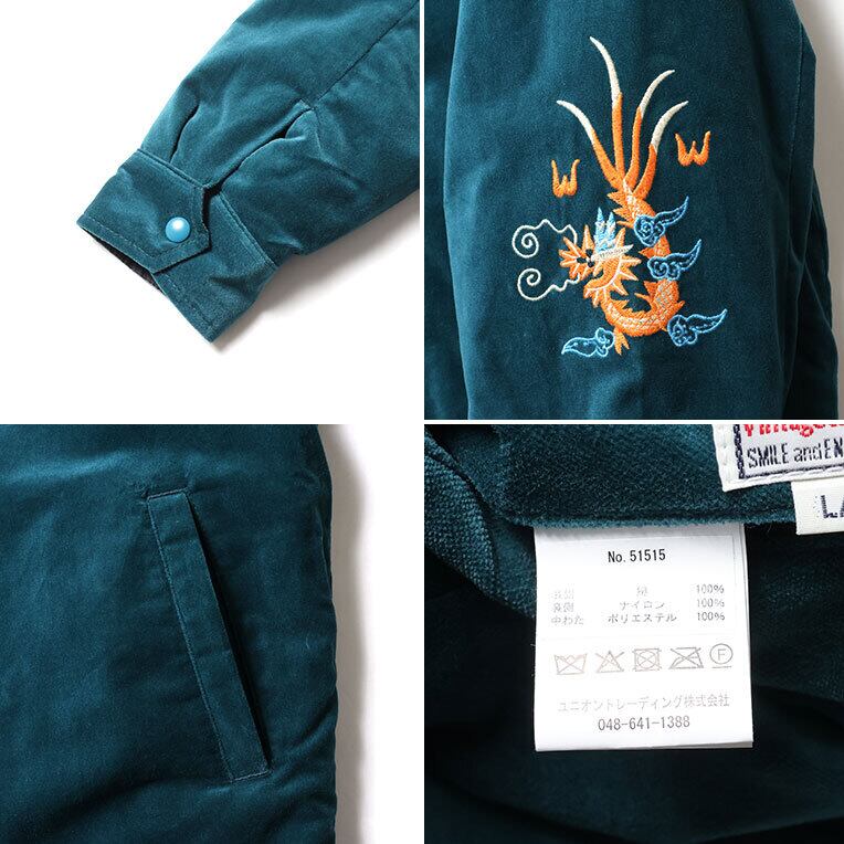 両袖には、龍と右胸に虎、左胸に福の刺繍を施された贅沢なステッチデザインにて表現。