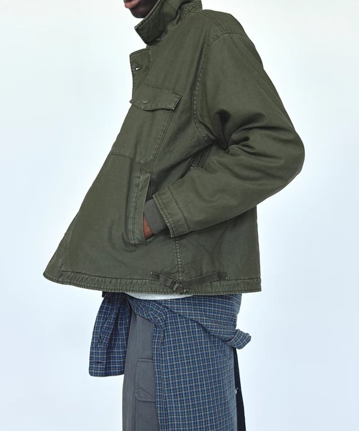 フロントにはUNIVERSAL社製のダブルジップを使用し、使い勝手と防風性を両立。経年変化を楽しめるミリタリーアウターとして、長くご愛用いただける一着です。