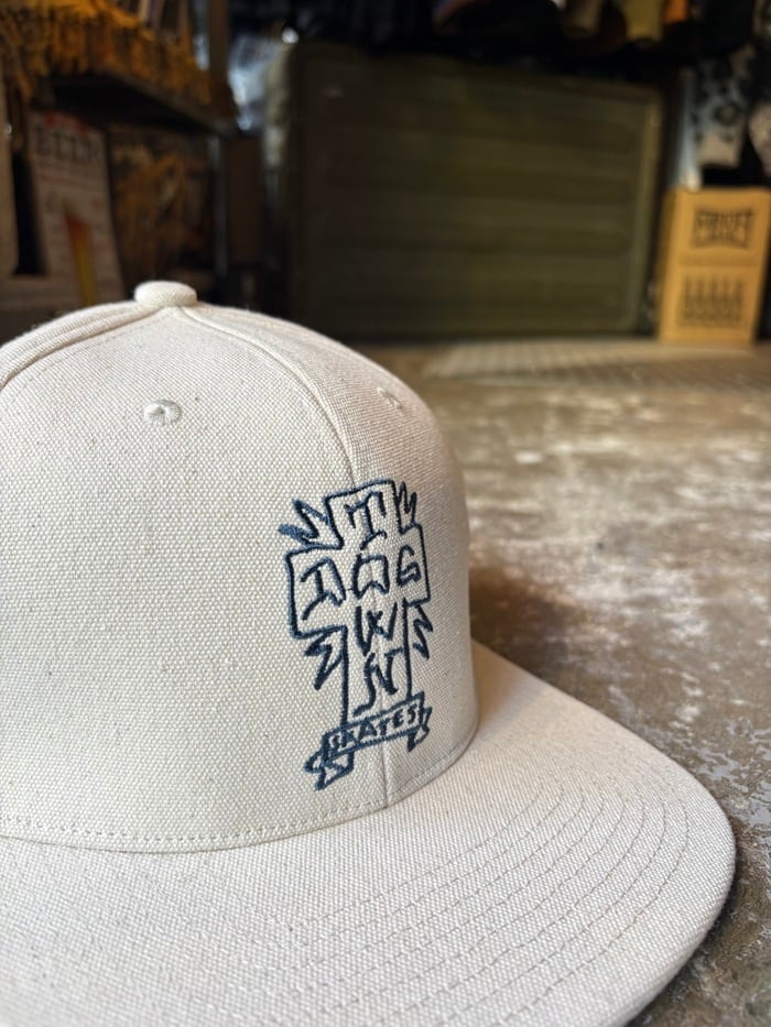 BLUCOオリジナルキャップにDOG TOWNのマークゴンザレスデザインのクロスロゴを刺繍。