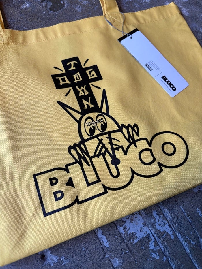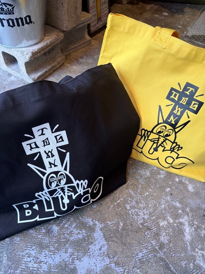 HOT ROD CUSTOM SHOW 2025 のためにデザインされた、MOONEYES × DOGTOWN × BLUCO によるトリプルコラボレーションプリントが施された、キャッチーで可愛いトートバッグです。