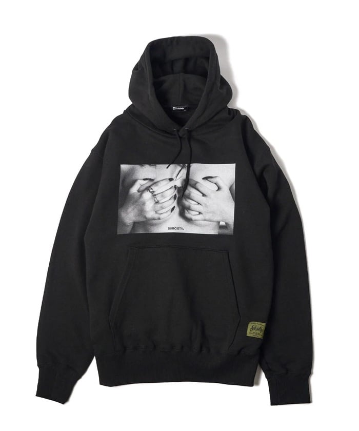 フロントに手ブラをしているフォトをインクジェットプリントで施したインパクト抜群の一着。