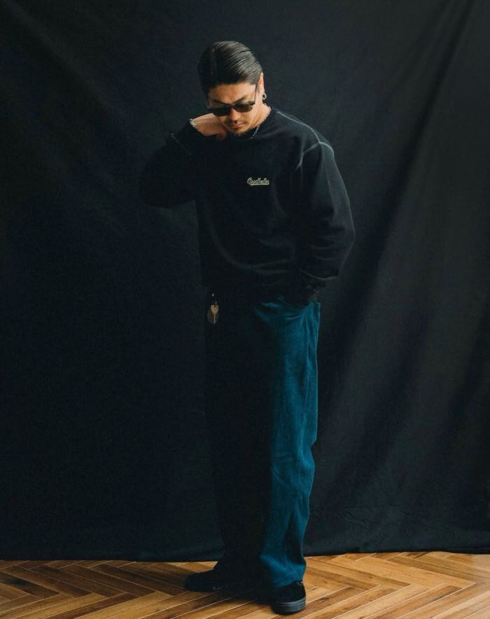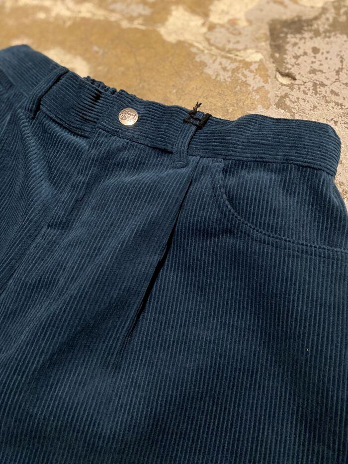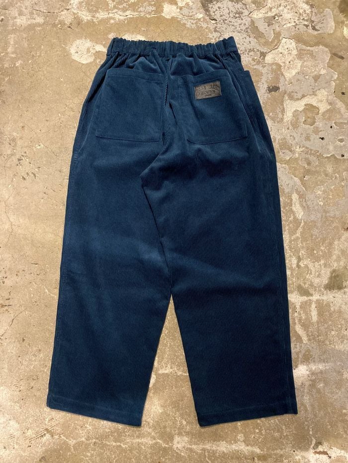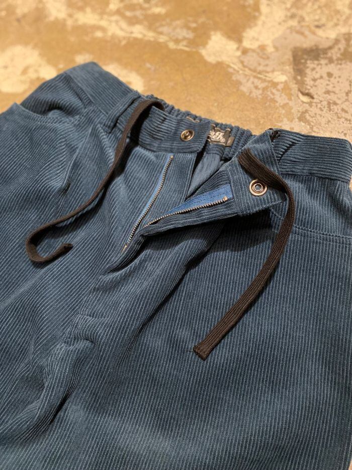 シルエットは股上を深く、ワタリから裾にかけて太めに設定したワンタック入りのワイドストレートタイプのパンツ。履き心地の良さを考慮しウェスト部分はゴムバンド、ベルト紐、ベルトループ付きイージータイプのコーデュロイパンツ。これからの時期に重宝できるのでは。ヒップポケットにはアクセントで買うハイドレザーのオリジナルワッペンをオン。