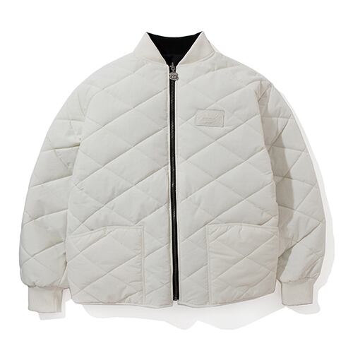 肉厚でしっかりとしたナイロン地をベースにオリジナルのダイヤキルトで作製した中綿キルティングを表地に採用し左胸にカウハイドレザーのオリジナルワッペンを配備致しました。