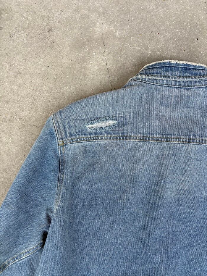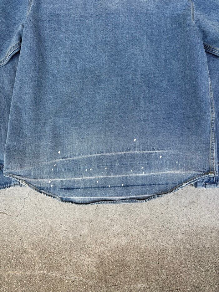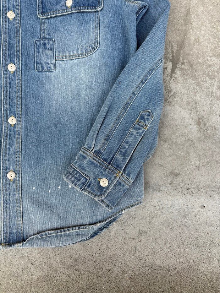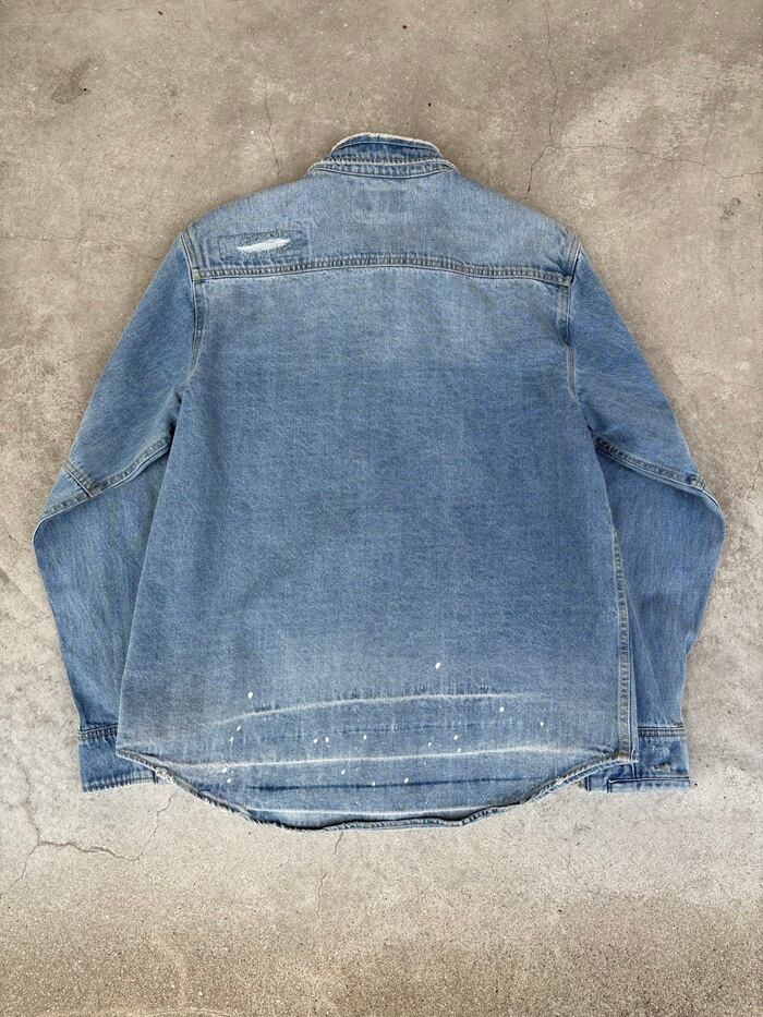 新品のデニムシャツをここまで着用すると生地も痩せて、取り扱いがデリケートになりがち、加工でその表情を作り新品のコンディションスタートでのこの表情はダメージ加工ならではで御座います。