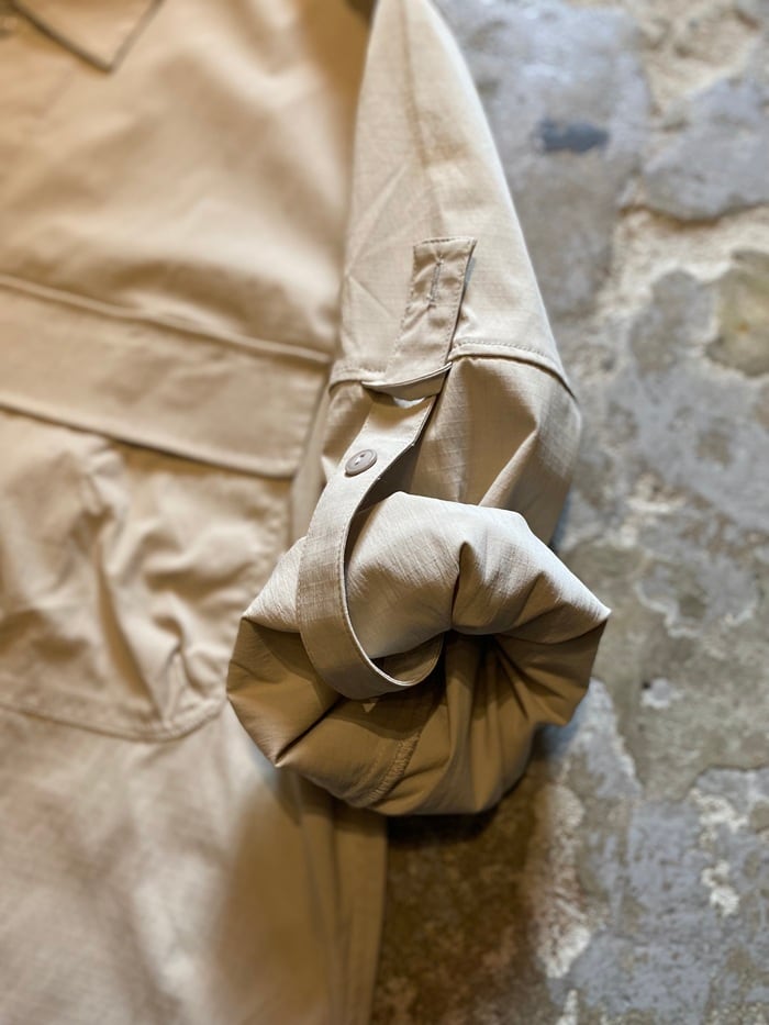 袖口へ向かうにつれて少しテーパーを入れており、袖幅には程よくボリュームを感じて頂けますが、袖口はシャープなデザインとなっており、動きやすいサファリジャケットらしさもお楽しみ頂けます。