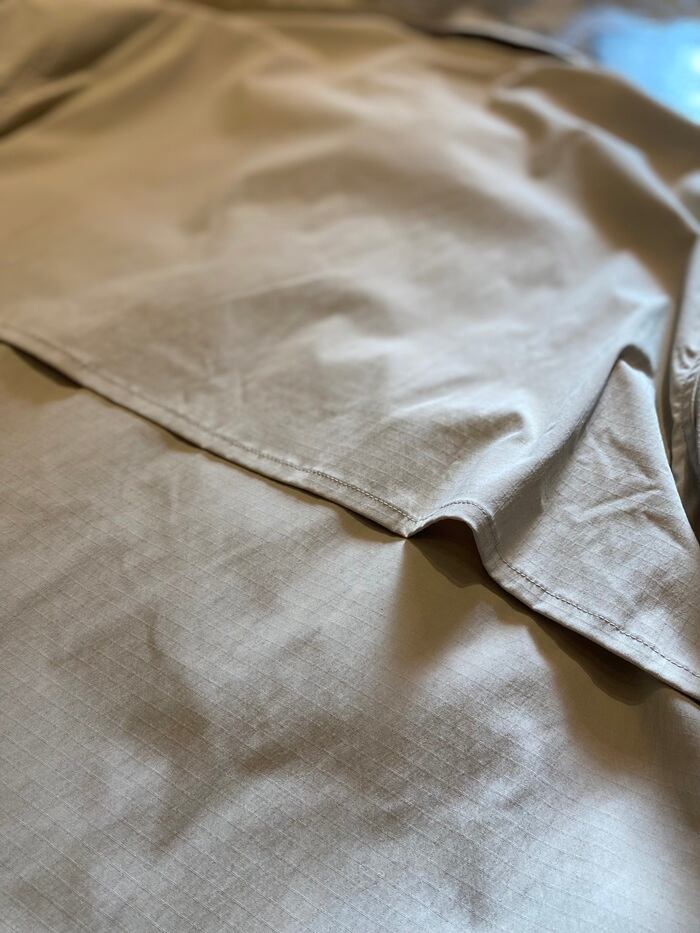 袖部分へは、肩回りのリラックスしたフィッティングを向上させる為、ハギを重ねることで稼働域を広くとれる使用となっております。