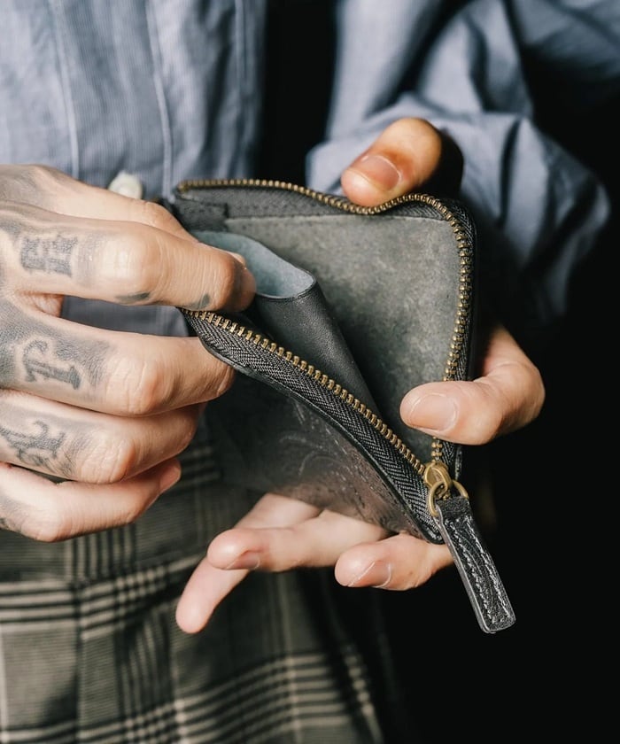 L字ファスナータイプのスタンダードな小型ウォレットとなっており、ポケットの嵩張りも少なくとても携帯し易いウォレットとなっております。