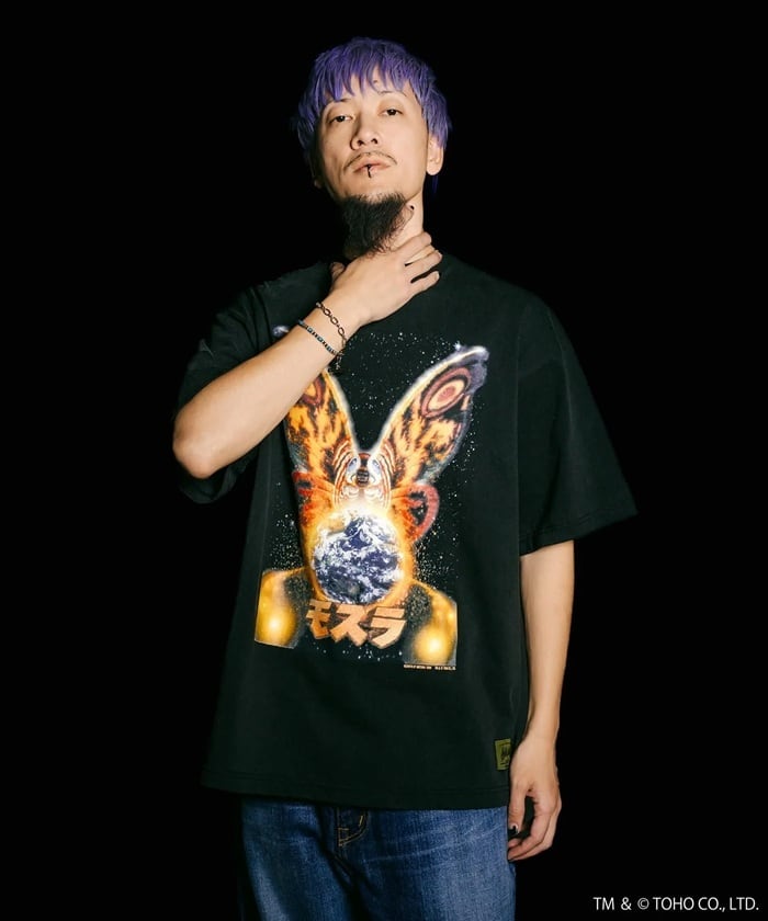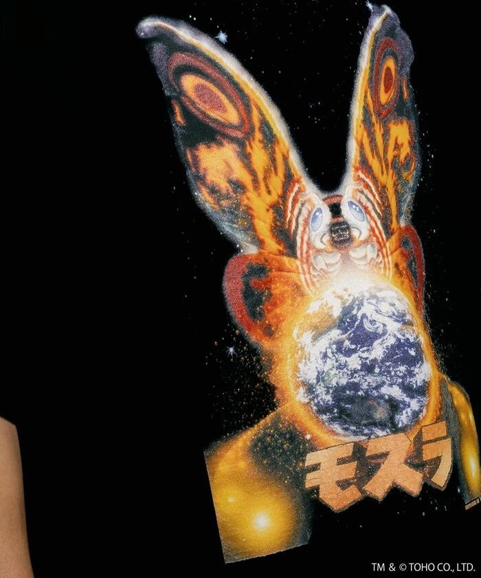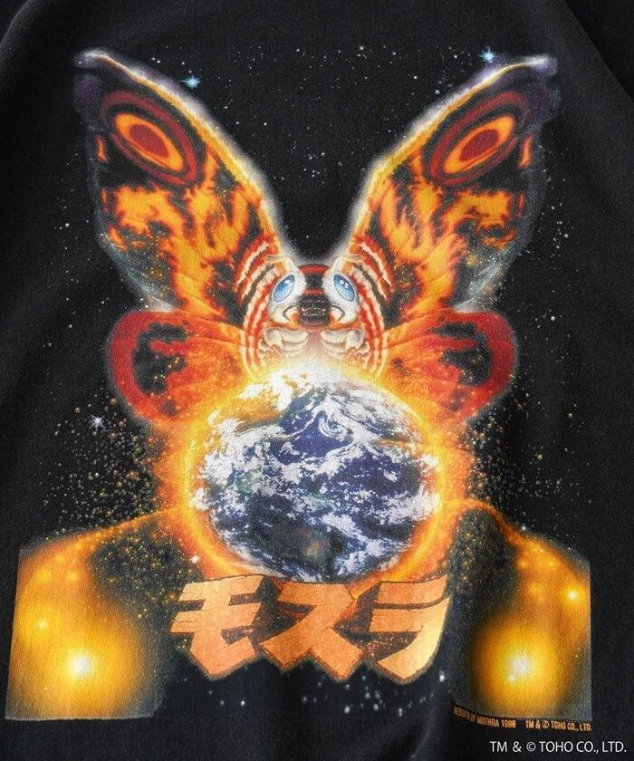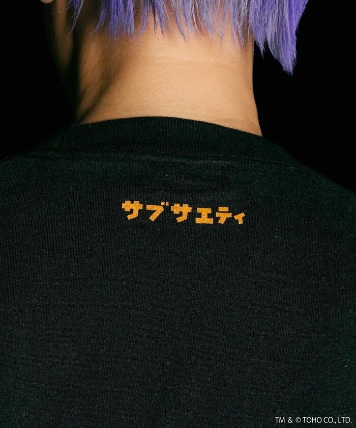 フロントには1996年に公開された『モスラ』のポスターグラフィックをブラックマジック風プリントで施しました。バックネックにはゴジラフォントに落とし込まれた「サブサエティ」のコラボロゴをプリントでオン。