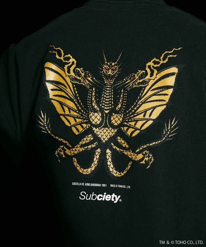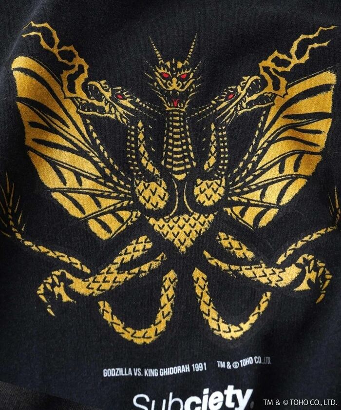 フロントにはオールドイングリッシュの「KING GHIDORAH」ロゴを、バックには1991年に公開された『ゴジラVSキングギドラ』からインスピレーションを受け、アメリカントラディショナルテイストに描き下ろしたキングギドラをプリントで施しました。