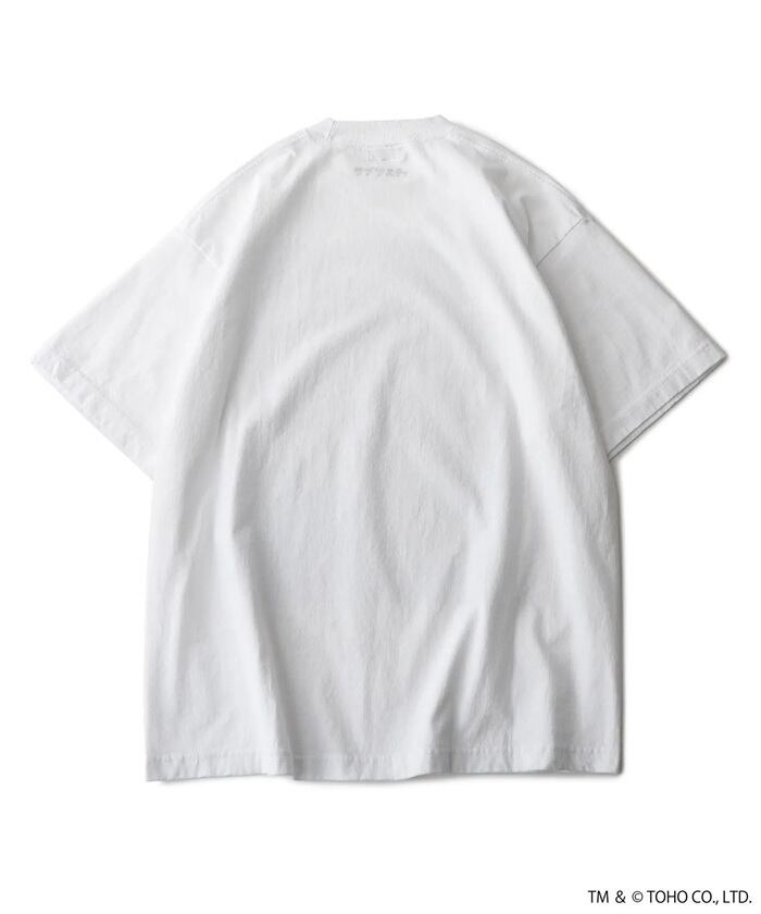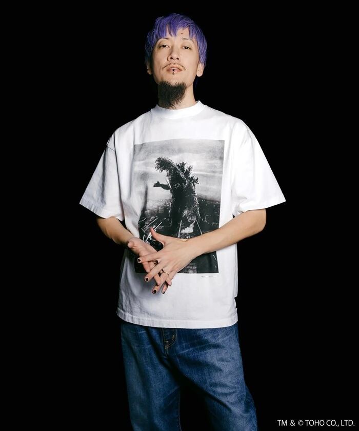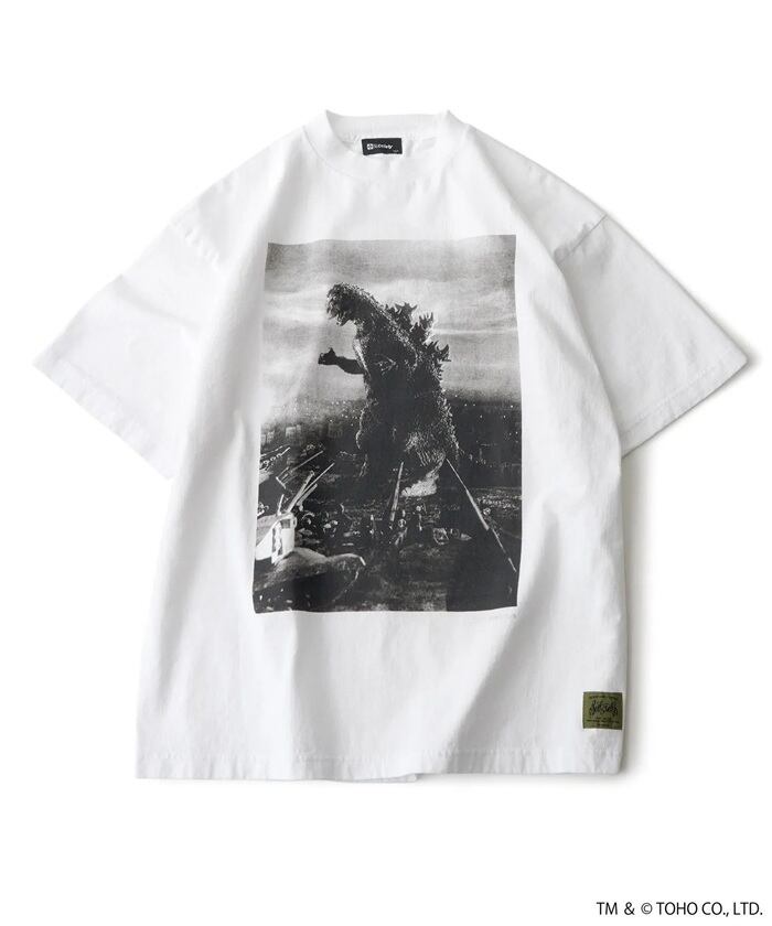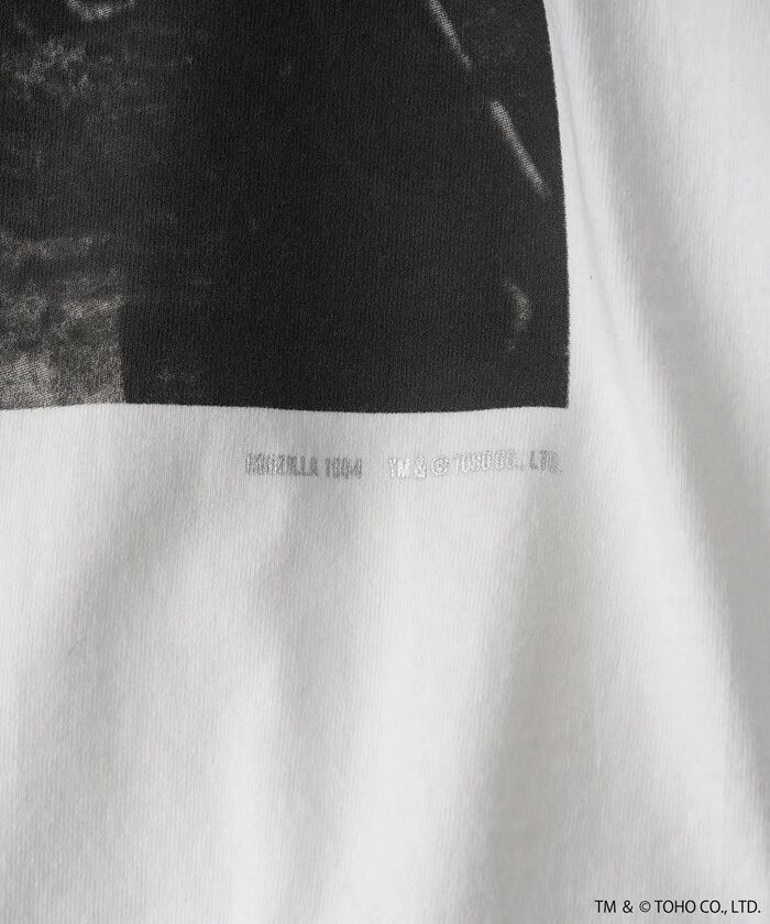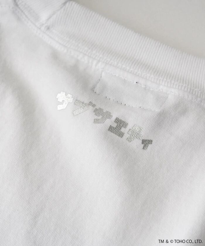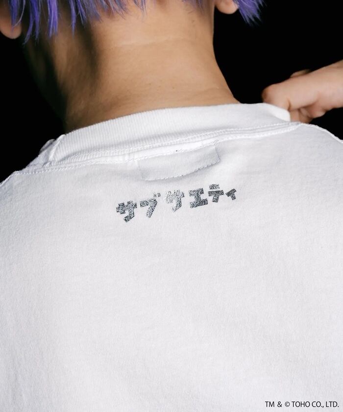 フロントには1954年に公開された『ゴジラ』のシーンを大判の水性プリントで施しました。クレジット部分は銀箔プリント仕様。バックネックにはゴジラフォントに落とし込まれた「サブサエティ」のロゴを銀箔プリントでオン。