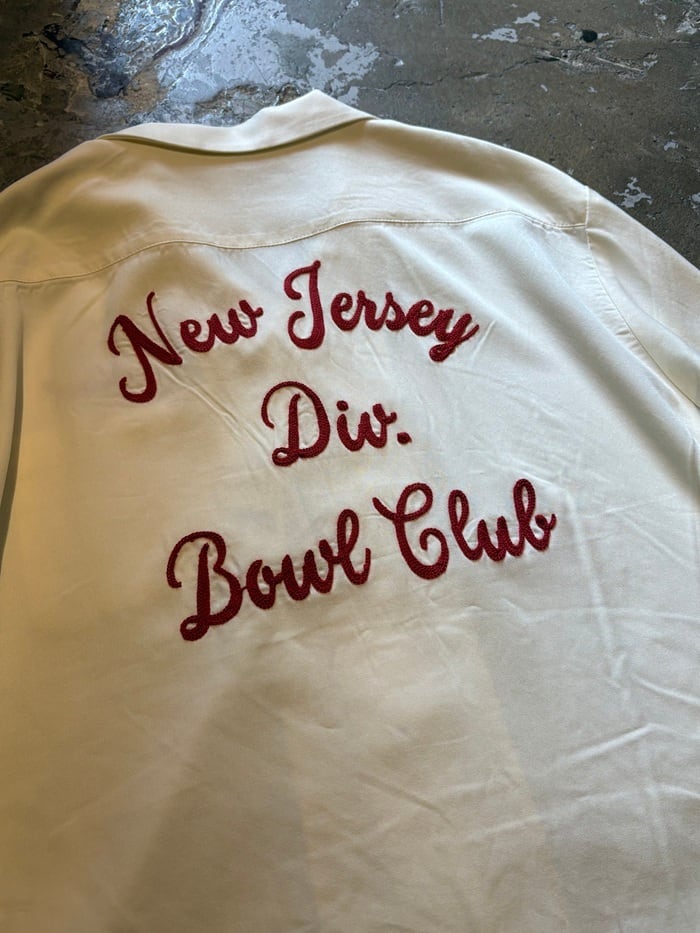 背面へは、雰囲気あるクラシカルなチェーンステッチでニュージャージーの文字をデザイン。