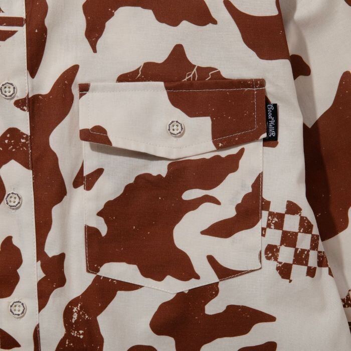 オリジナルで作製したカウ柄は所々に、チェッカー柄やクラッキングの柄、ブランドロゴを散りばめるGOOD HELLERらしいテキスタイルを一から作成。