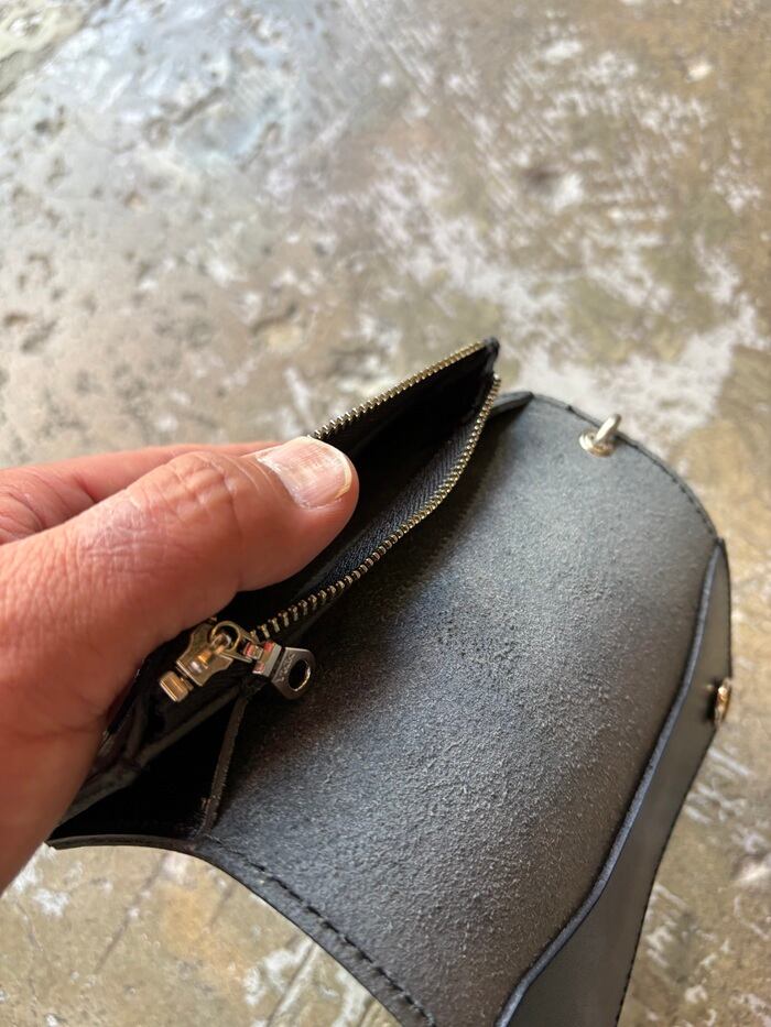 丁度センターにコインケースが来るデザインとなっており、カード、お札、コインと収納のストレージをフルで使った場合にウォレットの形が美しく収まる様デザインされております。