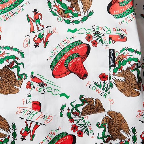 程良い肉感のコットン100%の生地をベースに、メキシカンテイストなオリジナルデザインをプリントした総柄シャツはこれからの時期重宝できるのではないでしょうか。
