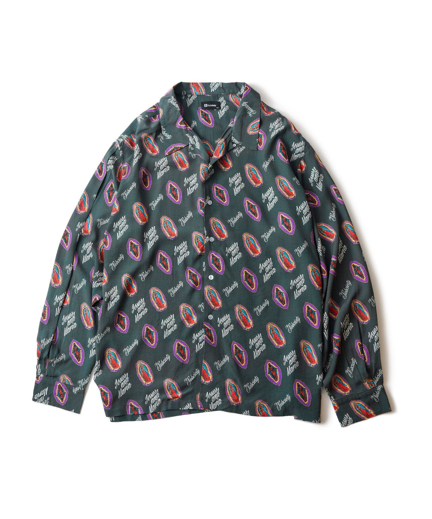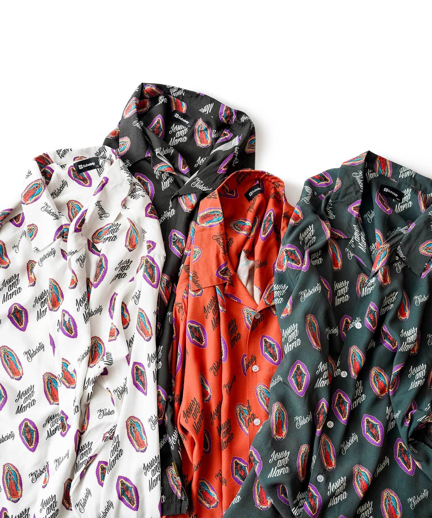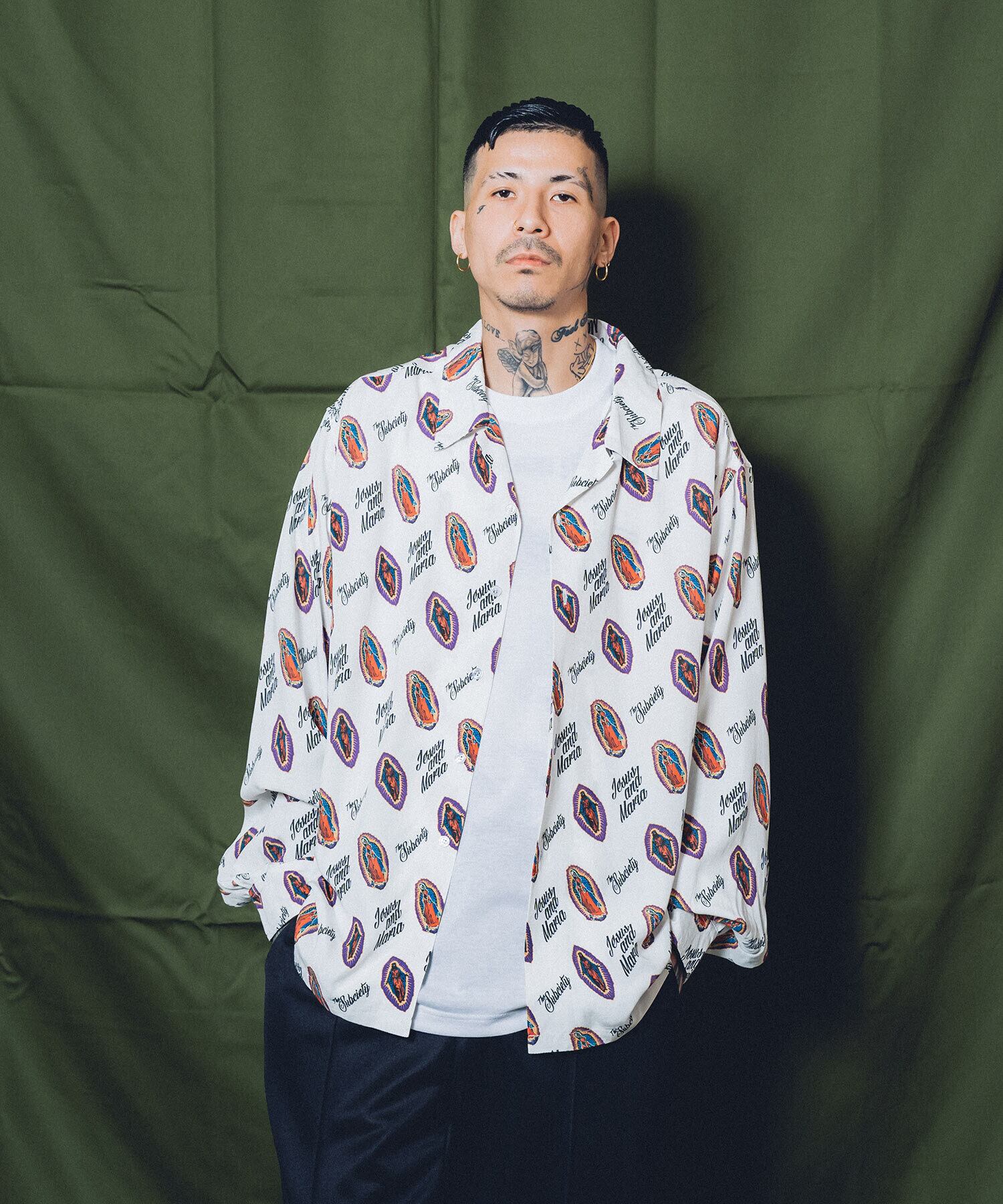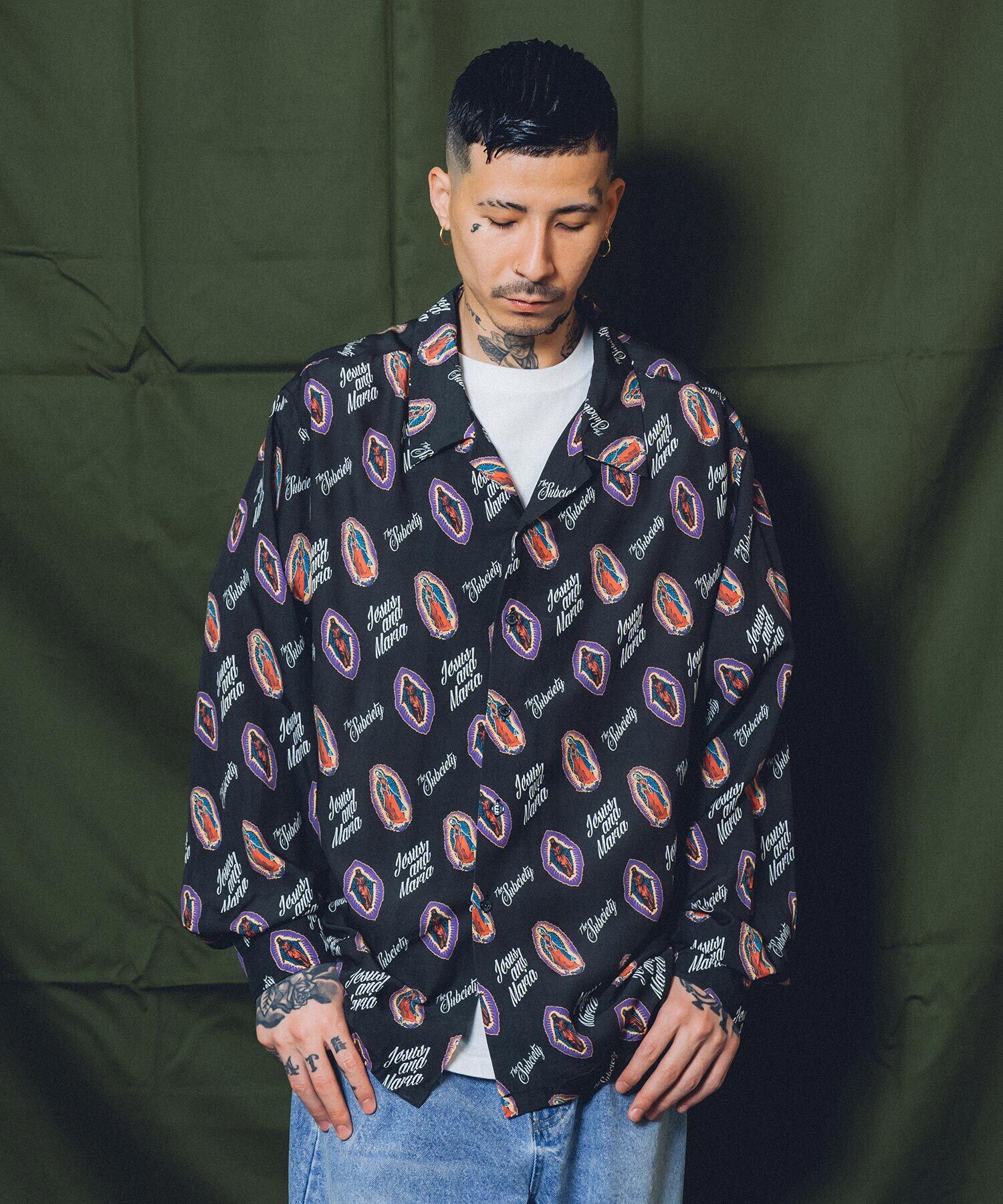 SUBCIETYの世界観を表現されたSKULL MARIA & JESUSのタトゥーモチーフの柄をタイポグラフィーにて、シャツ全面に表現された一着となっております。